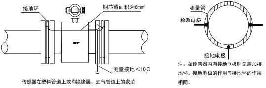 | 接地法蘭(或接地環(huán)) | 適用于非導(dǎo)體管道,如塑料管道、有襯里的管道,但有接地電極的傳感器不需要,為降低成本和使用效果,國內(nèi)電磁流量計廠家一般用增加一個接地電極代替接地環(huán)。 |